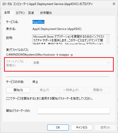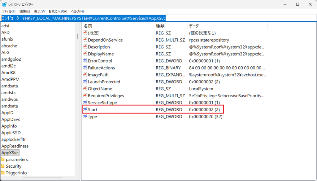 コンピューター\HKEY_LOCAL_MACHINE\SYSTEM\CurrentControlSet\Services\AppXSvcに移動します。
