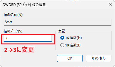 自動を手動に変更できれば変更してOKをクリックしますが、上記の様にグレーアウトしている場合はレジストリーの変更が必要になります。